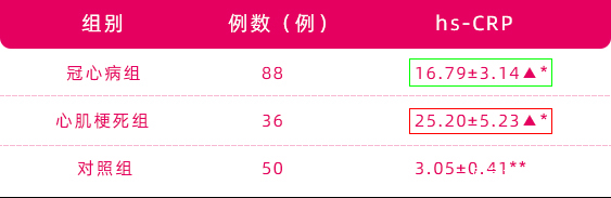 河南省新鄉市第一人民醫院對冠心病、心肌梗死患者hs-CRP的統計結果顯示:hs-CRP對心血管疾病具有提示作用,並對心血管病人的治療效果具有監測作用。