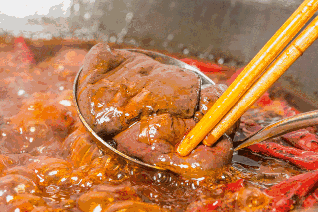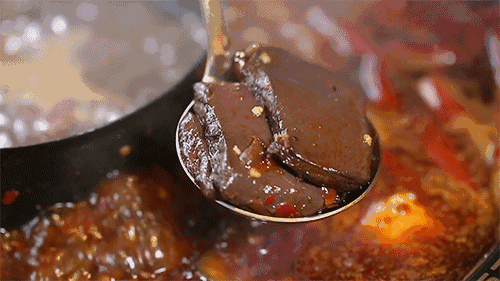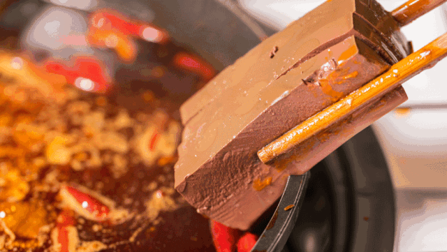 成都人吃火鍋,一碗鮮紅透亮的鴨血用刀劃成十六塊,漏勺一託,簌簌地倒入麻辣火鍋中,靜待8分鐘,等到沉在鍋底的生血都熟透,一塊塊紅褐色的鴨血慢慢浮上來,就可以開始慢慢享用涮鴨血的美妙滋味。