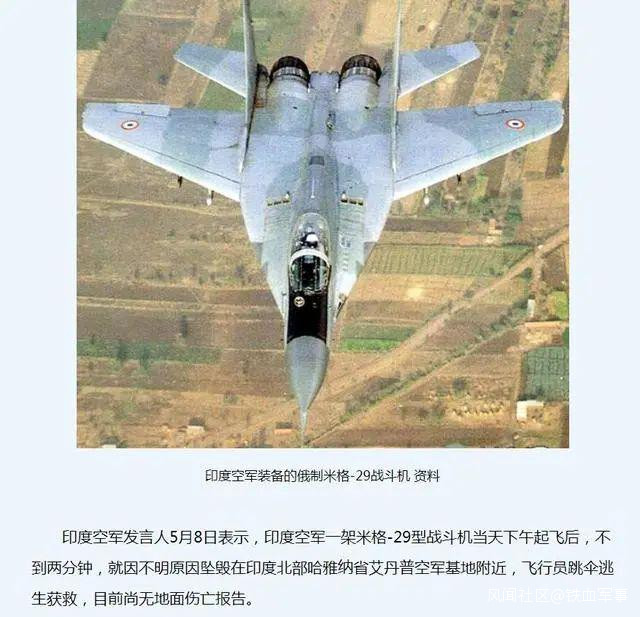 你5月7號寫我為什麼沒有墜機,那我5月8號就給你掉一架看看(調侃)—— 5月8日,印度空軍一架米格29戰鬥機在旁遮普省的賈蘭德哈爾地區執行飛行訓練任務時墜毀。