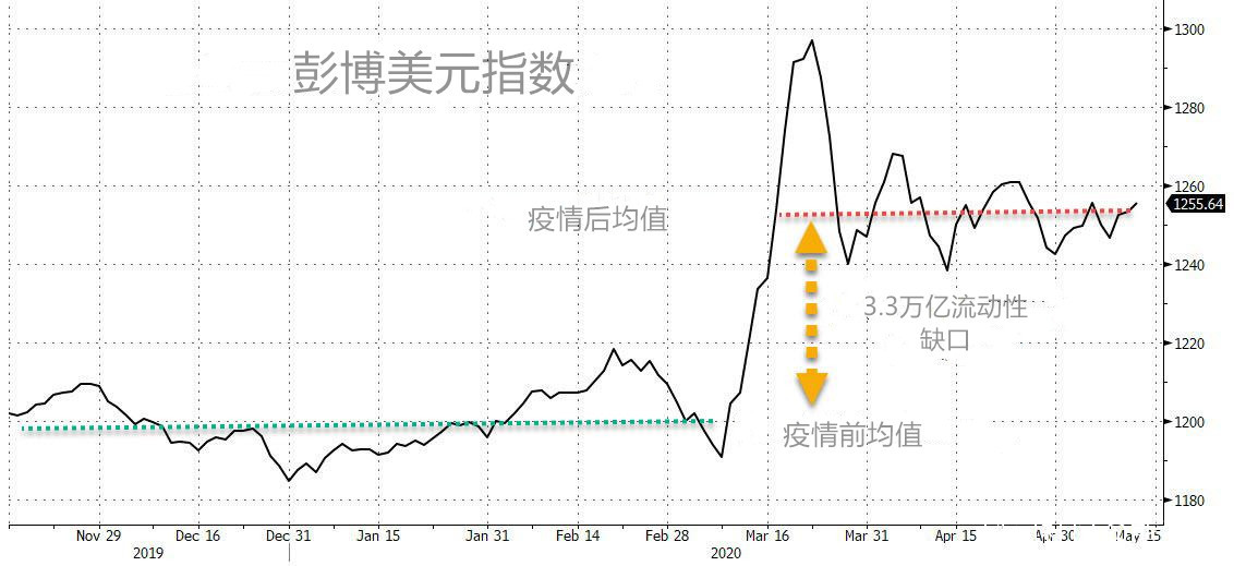 先不論其他扭曲期限溢價的因素,美聯儲已經別無選擇。因為,雖然美聯儲3月份以來大規模注入流動性,資產負債表從4.2萬億美元擴張至6.7萬億美元,但是在不施行負利率政策的情況下,依然不足以解決中性利率需達到-1%的問題。美元高挺就是這個問題最好的體現,比如美元荒問題,直到現在還不能恢復到疫情前的正常水平。