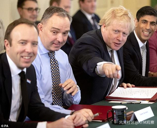 △從左至右為衞生大臣馬特·漢考克、內閣秘書馬克·賽德維爾、首相約翰遜 圖據《每日郵報》