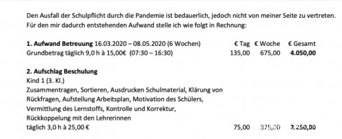 建築師Karin Hartmann也將自己開的賬單寄給了北威州政府,並對媒體介紹了每筆費用的根據。她認為,國家本有提供教育的義務,而現在卻通過封校,把這部分勞動轉移給了家長。那麼,家長索要這部分“勞務費”也是理所應當——就像企業外包業務要付錢一樣。