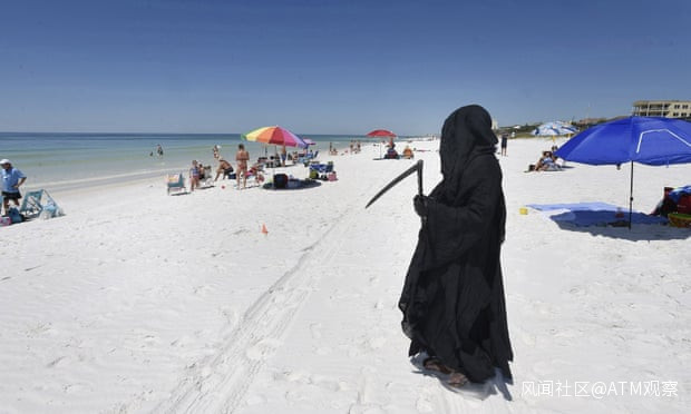 同樣也是在佛州,該州還發生了支持封鎖令的示威活動。《衞報》報道稱,上週,一位名叫丹尼爾·烏菲爾德(Daniel Uhlfelder)的男子稱自己擔心海灘解封可能會加劇疫情蔓延,因而他穿上黑色斗篷,扛着大鐮刀,打扮成“死神”的模樣,漫步在佛羅里達州的海灘上,以此呼籲民眾保持社交距離,同時敦促州政府謹慎解封。