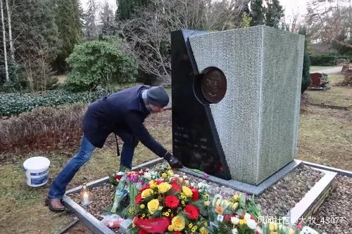 1月5日,在德國柏林西郊的威廉皇帝紀念教堂墓園,西門子公司職員托馬斯·旺格勒將一枝鮮花放在拉貝墓前。新華社記者 任珂 攝