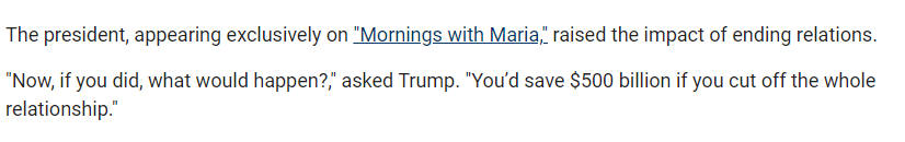 “那如果你這麼做了,會發生什麼呢?如果我們完全切斷與中國的關係,每年可以省下5000億呢”,特朗普説。