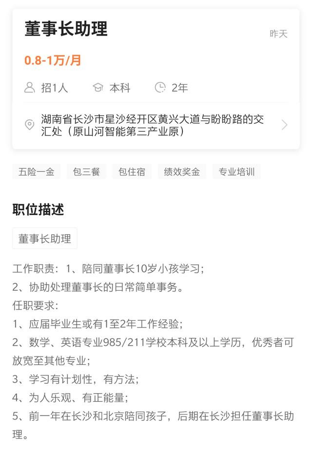 值得注意的是,還要求應聘者“前一年,在長沙和北京陪同孩子,後期在長沙擔任董事長助理。”關於崗位待遇,目前設有“五險一金、包三餐、包住宿、績效獎金、專業培訓”。
