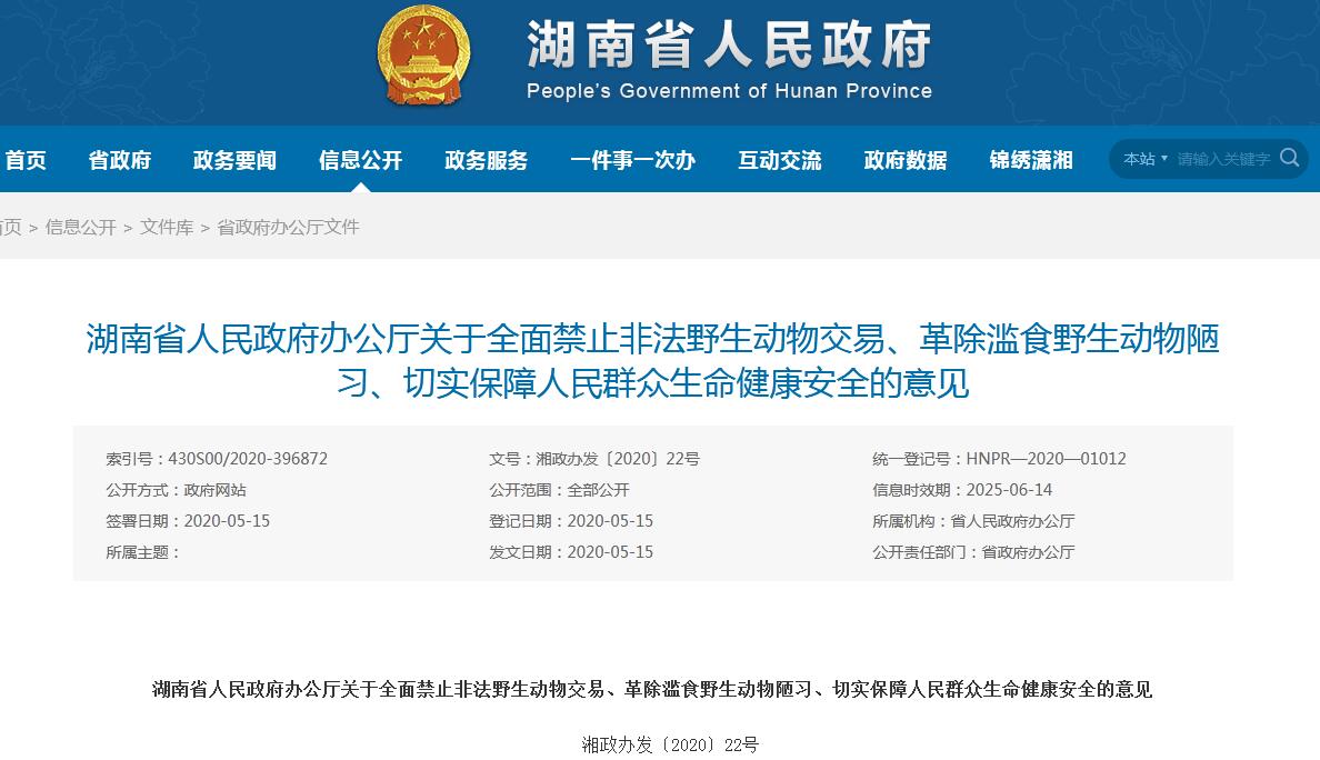 5月15日,湖南省政府發佈《關於全面禁止非法野生動物交易、革除濫食野生動物陋習、切實保障人民羣眾生命健康安全的意見》(下稱“意見”),提出全面禁止食用陸生野生動物,對依規退出的陸生野生動物人工繁育主體給予一定補償,對禁食後停止養殖的在養野生動物進行妥善處置。