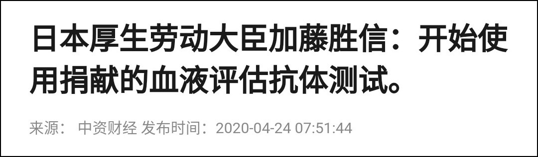 “日本政府計劃6月份開始實施約1萬人規模的新冠病毒抗體檢測,調查具體感染人數以及新冠病毒在日本開始傳播的具體時間。在實施正式檢測前,厚生勞動省從4月下旬開始進行性能測試……”