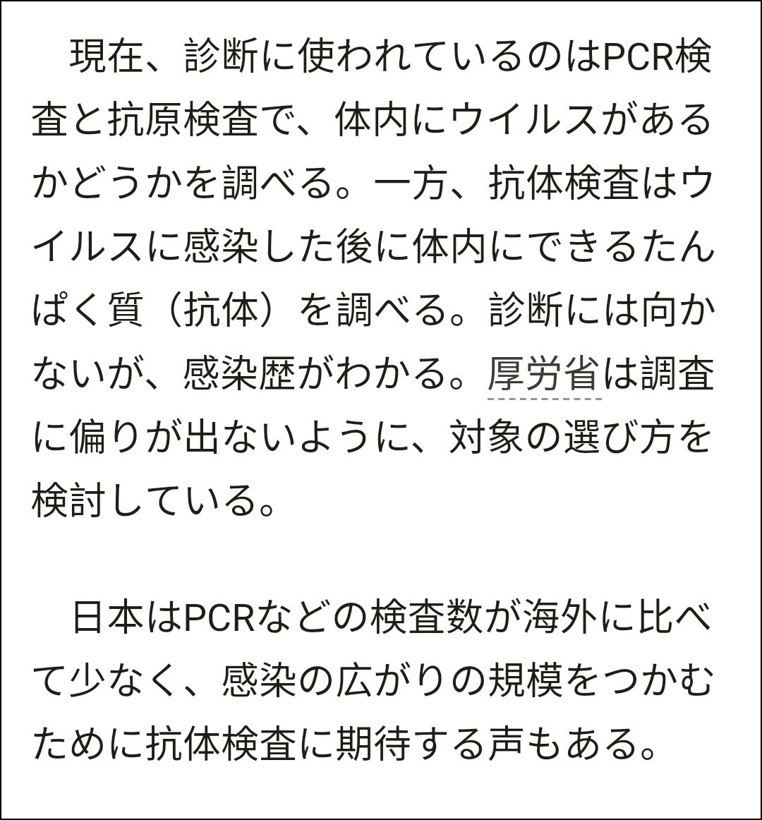 “現在診斷所使用的是用核酸檢查與抗原檢查來查體內是否有病毒。而抗體檢查是查的感染病毒後體內形成的蛋白質(抗體),這不適合診斷,但是能知道感染史。厚生勞動省為了不使檢查發生偏差,正在考慮檢查對象的選擇方法……”