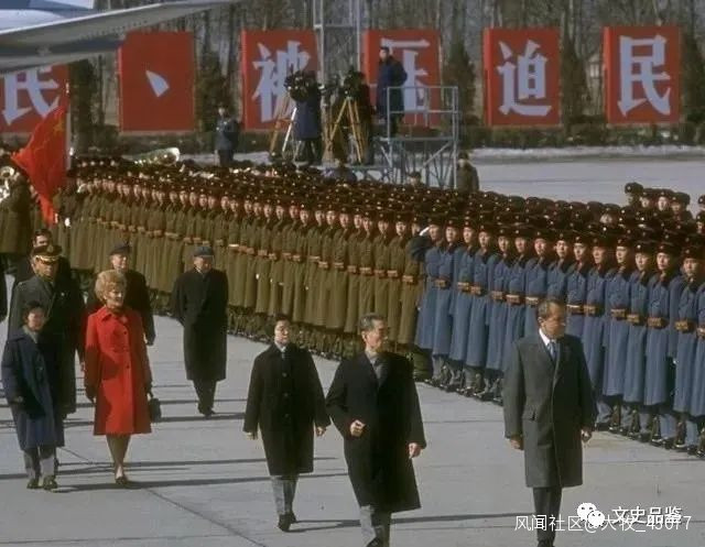 1972年,尼克松首次訪華。當他走下空軍一號專機時,眼前是中國外交史上前所未有的規模龐大的儀仗隊伍,同時還有停機坪上矗立的巨大的標語牌。