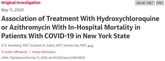 本週《美國醫學會雜誌》(JAMA)也發表了紐約州25家醫院隨機抽樣共1438例確診患者的回顧性隊列研究,代表了紐約州都會區88.2%的COVID-19患者。所有患者的總體住院死亡率為20.3%。接受羥氯喹+阿奇黴素的患者死亡率為25.7%(189/735),接受羥氯喹的患者死亡率為19.9%(54/271),接受阿奇黴素的患者死亡率為10.0%(21/211)。