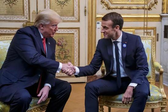 美國總統特朗普與法國總統馬克龍握手(資料圖) 從現在美國對中國打壓最厲害的科技層面上來説。美國和中國全面脱鈎後,中國會受到很大影響,有悲觀的聲音覺得中國在科技層面,比如芯片等領域會倒退十幾年。