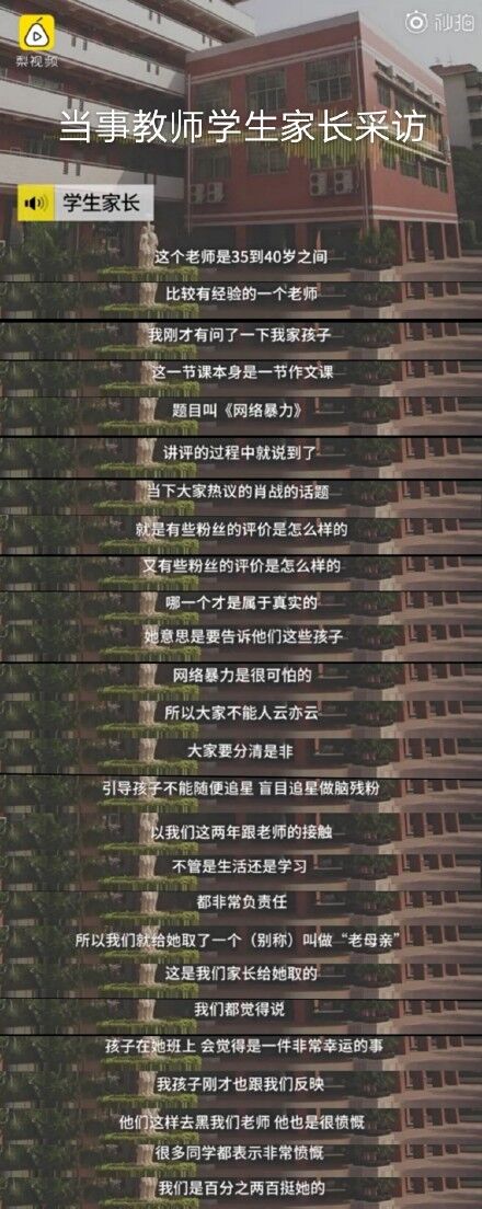 未透露姓名的學生家長在接受@梨視頻採訪時表示:涉事老師年齡在35到40歲之間,教學經驗豐富。據自己孩子反映,當時本來就是作文課題《網絡暴力》的講評課。涉事老師的本意要告訴孩子們,網絡暴力很可怕,大家不能人云亦云,要分清是非,不能隨便追星、盲目追星、做腦殘粉。