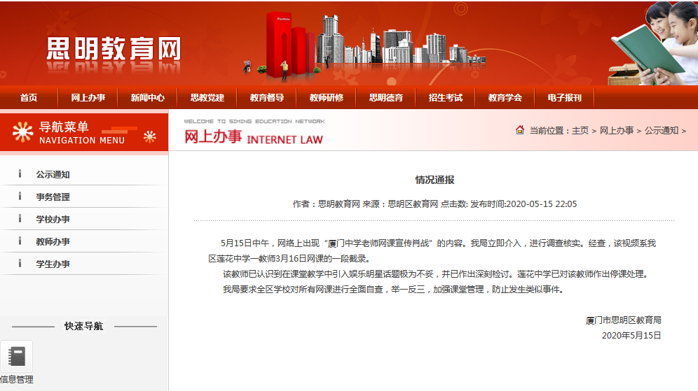 5月15日中午,網絡上出現“廈門中學老師網課宣傳肖戰”的內容。我局立即介入,進行調查核實。經查,該視頻系我區蓮花中學一教師3月16日網課的一段截錄。
