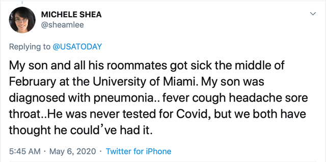 網民:“我兒子在邁阿密大學讀書,他和他室友2月中旬就病了。我兒子被診斷為肺炎,發燒、咳嗽、頭疼、嗓子疼。他從未接受過新冠病毒檢測,但我們都覺得他應該檢測一下。”↓↓↓