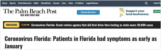 佛羅里達州於3月1日首次報告該州的2例確診病例。《棕櫚灘郵報》分析稱,在官方宣佈病毒在佛羅里達州蔓延前的兩個月內,可能已有171人感染。