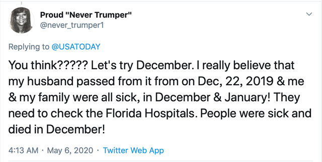 網民:“我確信我丈夫是在2019年12月22日因新冠病毒去世的。我和我的家人去年12月和今年1月都生病了。官方應該檢查佛羅里達州的醫院,人們在12月生病、死亡!”↓↓↓