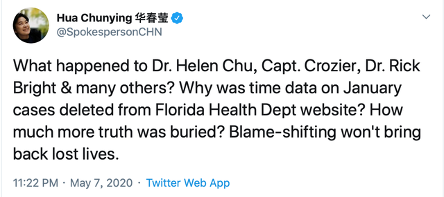 佛羅里達州衞生部門為什麼要刪除1月份疫情相關的關鍵信息?究竟要掩蓋什麼?誠如中國外交部發言人華春瑩在海外社交媒體上所説,“還要埋葬多少真相?推卸責任不會挽回失去的生命。”