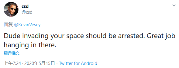 這名男子故意想要打破兩人之間“社交安全距離”的舉動讓維西嚇得不輕,他戴着口罩一邊後退,一邊對着抗議者叫喊:“你離我遠一點,離我遠一點!”