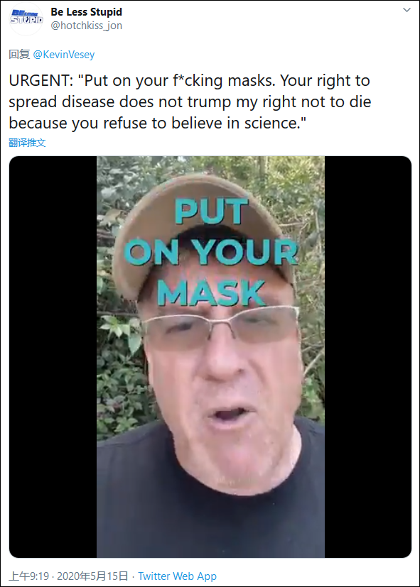 還有一位網友回覆時更是無比憤怒,直接拍攝了一段視頻回應:“給我帶上口罩!比起你們傳播病毒,我能夠活下來才更重要!”
