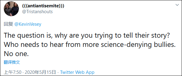 有維西的推特粉絲在他的內容下方回覆,替他感到不值得:“可問題是,誰讓你講述這些人的故事了?誰想了解這些否定和無視科學的‘惡霸’?沒有人!”