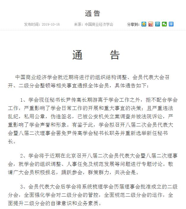 第二天,學會官網通告,尹傳高長期遊離於學會工作之外,嚴重違法亂紀,已被公安機關立案調查並被法院訴訟,準備開會罷免尹傳高的職務。