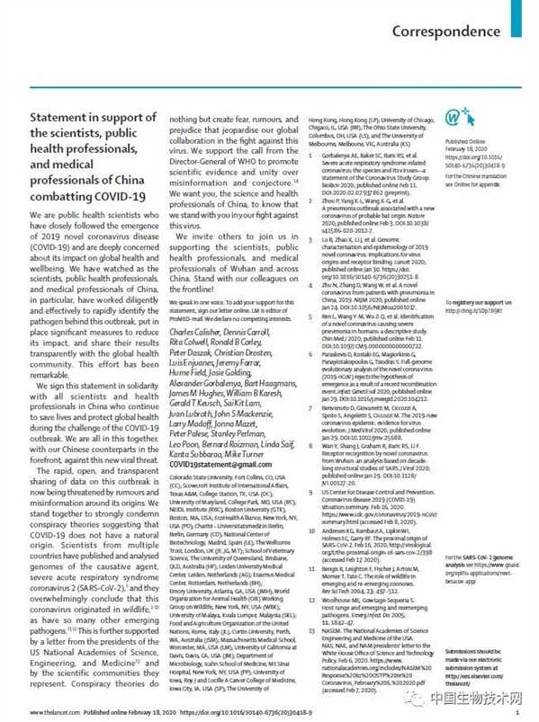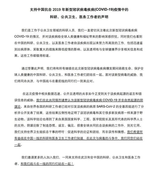 全球頂級科學家不久前在國際頂級雜誌《柳葉刀》發表聯合聲明,“強烈譴責認為該新型冠狀病毒疾病並非自然起源的陰謀論”,並“支持中國抗擊2019新型冠狀病毒疾病疫情中的科研、公共衞生、醫務工作者”。