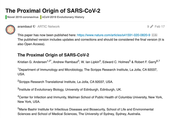 比如斯克利普斯研究所的著名病毒進化學家Kristian Andersen在virological.org發表文章,反駁了 “人工合成”陰謀論,文章已被眾多著名病毒學家轉載並支持。