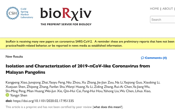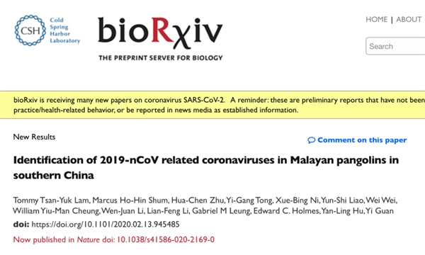 另外,華南農業大學、香港大學管軼教授與廣西醫科大學胡豔玲教授,都在預印本網站bioRxiv 發表研究論文(https://www.biorxiv.org/content/10.1101/2020.02.17.951335v1,https://www.biorxiv.org/content/10.1101/2020.02.13.945485v1),表明在穿山甲樣本中發現了與COVID-19病毒類似的冠狀病毒。