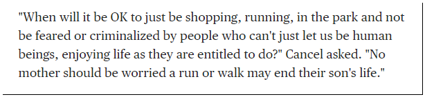 “什麼時候我們才能像個正常人一樣去公園跑個步,享受生活,而不是被那些不把我們當人看的人當成罪犯”,她問道,“一個母親不該總擔心自己的孩子出門跑個步就沒了命吧”。