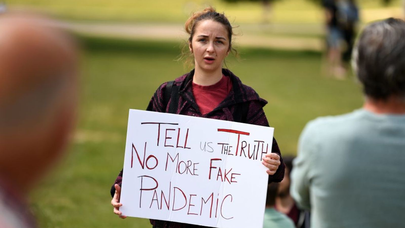 一名女子舉着標語牌:告訴我們真相,不要再製造更多假疫情了