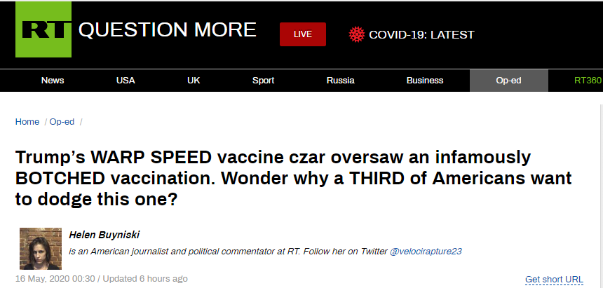 當前美國新冠肺炎疫情嚴重,美國約翰斯·霍普金斯大學發佈的統計數據顯示,截至北京時間16日13點32分,美國累計新冠肺炎確診病例增至1443397例,死亡病例增至87568例。疫苗研發對新冠疫情防控至關重要,是戰勝疫情的關鍵。不過,今日俄羅斯電視台網站16日卻報道稱,美國政府催促多部門和醫藥公司加速疫苗研發。在這樣的情況下,美國一些公司研製的疫苗,跳過動物實驗,直接進行人體臨牀試驗,其安全性引發質疑。