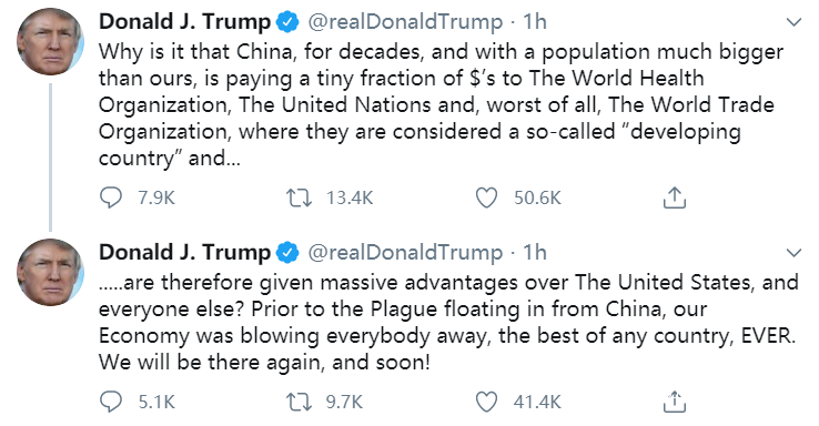 “為什麼中國,一個人口比我們多那麼多的國家,幾十年來,給世衞組織、聯合國、尤其是給世界貿易組織就交那麼一點點美元呢?在這些組織裏中國都被當做‘發展中國家’,就能相比美國和其他國家獲取大量優勢?在瘟疫從中國漂來之前,我們的經濟已經天下無敵,是所有國家裏最最好的!我們將重回那個巔峯,很快!”
