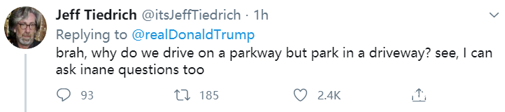 網友Jeff Tiedrich説,為什麼我們要在該停車的地方開車,卻在該開車的地方停車呢?看,我也能問出一個“瘋問題”。↓