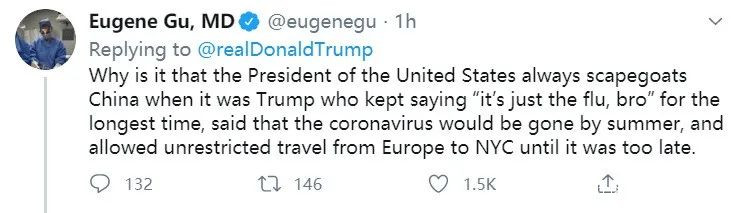 “為什麼美國總統總是要拿中國當替罪羊?堅稱新冠‘就是流感’時間最長的是特朗普,説新冠夏天就會消失的也是特朗普,允許歐洲人不受限地前往紐約的還是特朗普。”