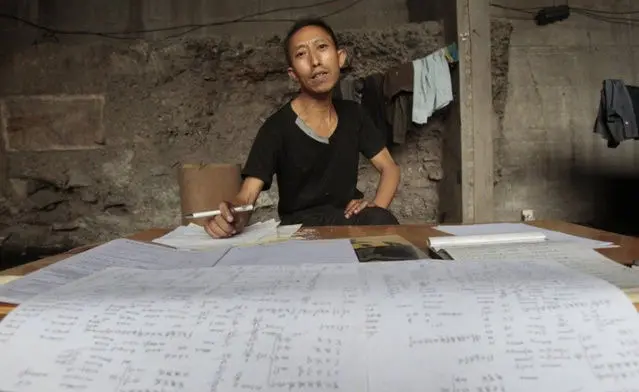 圖為老王指着一組數字公式告訴記者,用這組公式推算彩票十期開獎號碼,加以計算,不敢説中一等獎,二等獎是板上釘釘的事情。
