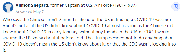 誰説中國在尋找COVID-19疫苗方面不比美國領先兩個月?而且,美國並不像自己宣稱的那樣,幾乎一點都不知道COVID-19。在中情局或疾控中心沒有任何朋友的情況下,我在一月初就知道COVID-19,我想美國早在我知道之前就知道了。特朗普決定不對COVID-19採取任何行動,並不意味着美國對此一無所知,也不意味着疾控中心沒有調查此事。