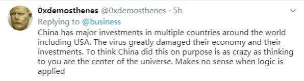 “中國在包括美國在內全球多數國家都進行了大量投資。病毒已嚴重傷害到了他們的經濟和投資。認為中國是故意這樣做,就跟認為你自己是宇宙中心一樣瘋。毫無邏輯。”