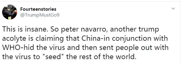 “這是瘋了吧。彼得·納瓦羅,特朗普的又一名追隨者竟然聲稱中國與世衞組織一同隱藏了病毒,然後派人把病毒“播種”到世界其他地方。”