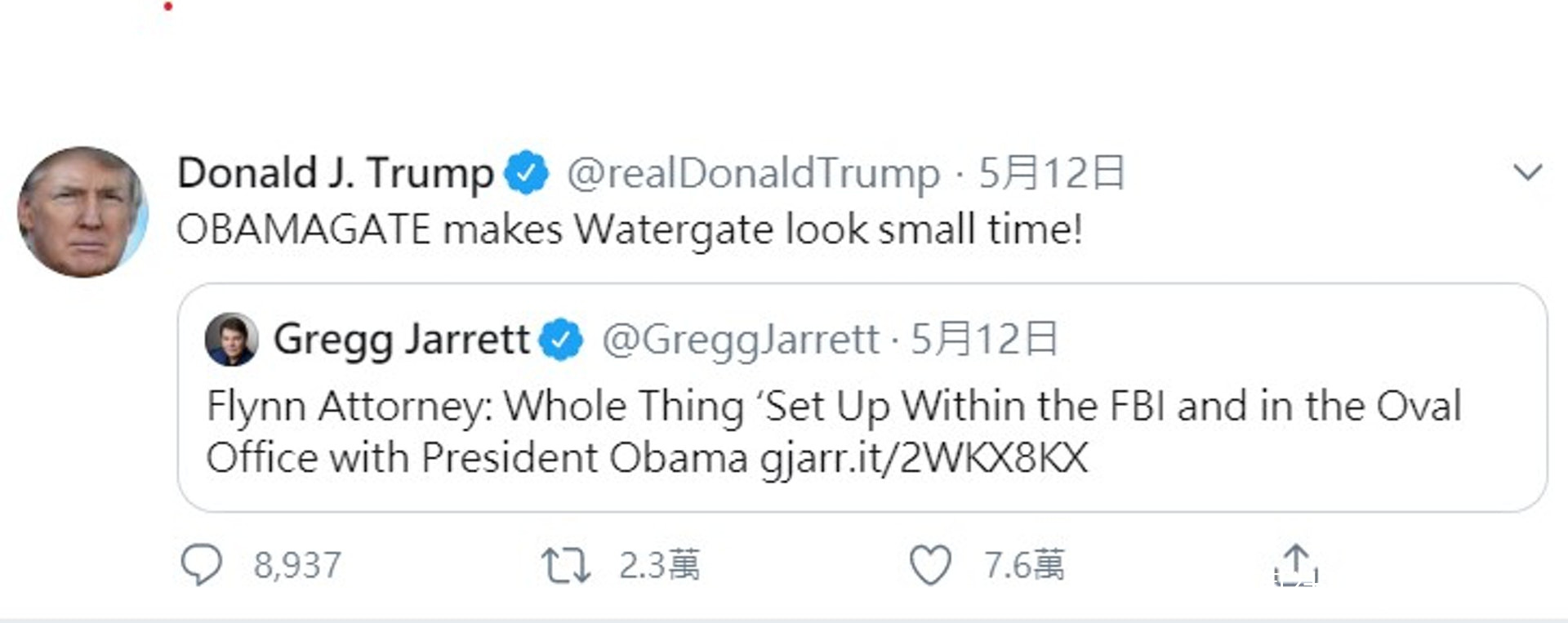 「我的對手不是睡眼惺忪的拜登。他根本不在考慮因素之列……我的對手是極端左派、什麼都不做的民主黨人跟他們的同夥、真正的反對黨、垃圾主流假新聞媒體。」特朗普週六(5月16日)早上在Twitter上如是説。五個小時之後,他的Twitter網頁上就出現了「奧巴馬門!」(OBAMAGATE!)的簡單「呼號」。
