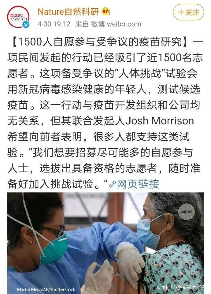 目前,有一個叫【1 day sooner】的民間組織發起了一項倡議被著名的Natur雜誌注意到了,這項倡議號召志願者故意感染病毒,以加快疫苗的研發速度。該倡議已經吸引了1500多名志願者。