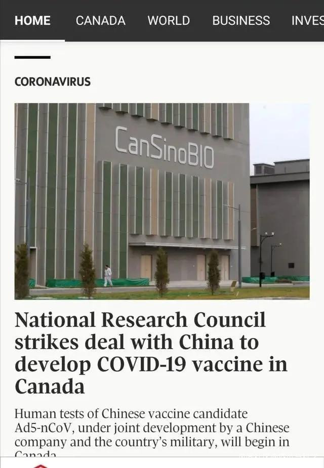 雖然中國的2019冠病疫苗研發世界領先,但由於國內病例太少,無法最終驗證疫苗的人羣保護效果。據加拿大媒體《環球郵報》當地時間5月12日報道,中國合已與加拿大合作開發2019冠病疫苗,將在加進行人體臨牀試驗。