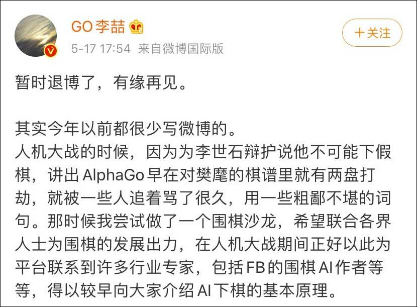 他在微博中表示,自己從為李世石辯護説他不可能下假棋開始到現在,一直會在網絡上受到言語攻擊,無論是微博還是微信公眾號等其他網絡平台。