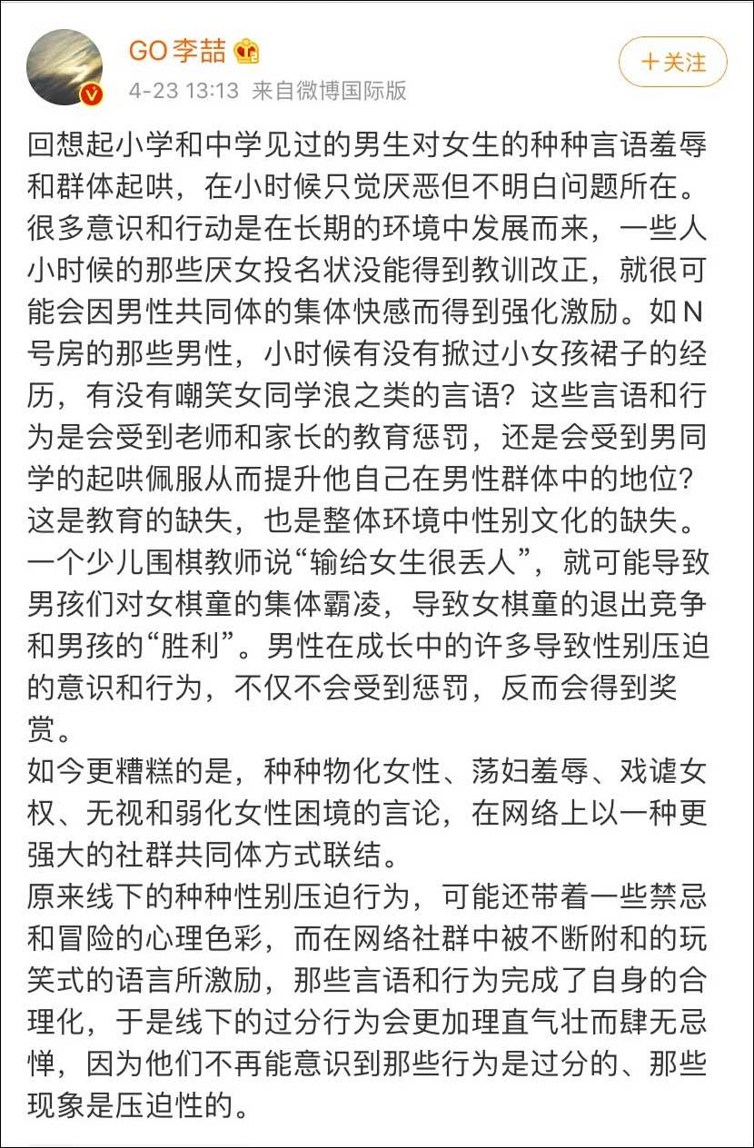 上文提到,觀網用户曾經引用過李喆有關女權的觀點,在不少網友看來,相較於屢屢引發爭吵站隊的柯潔,李喆的表達更深入,更能發人思考。下圖是原文引用的李喆的微博。