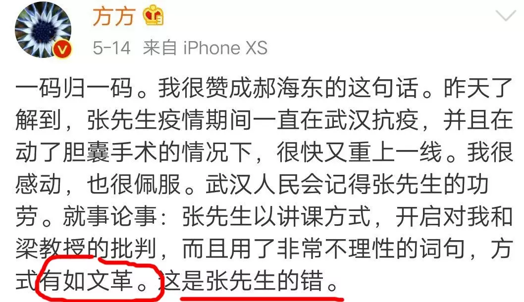**我記錄在此。等着方方的道歉。或許近期她不會,但我相信總有一天她會,如果她尚有基本的常識、判斷以及良知的話。我不知道方方有什麼偉業,但是她這幾個月的言行將會是她一生的污點,即使她道歉也無法洗掉這個污點!**