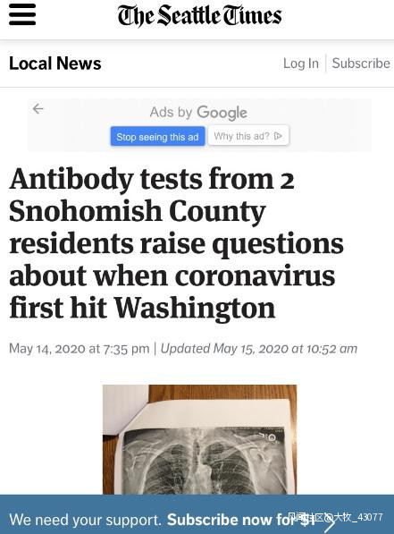 抗體測試報告顯示 新冠病毒可能去年12月已在美國出現據《西雅圖時報》報道,華盛頓州斯諾霍米什縣的兩名居民在12月患上了類似於新冠肺炎的症狀,之後在對新冠病毒的抗體檢測呈陽性反應。這一結果表明,新冠病毒可能比想象中的更早在美國出現。