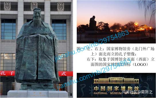 在中國文化傳統中,位置、方向都有着特定的文化含義,崇尚周禮並初集禮論之大成的孔子以及後世儒者都講究這些,特別是《禮記·學記》也講明瞭:“大學之禮,雖詔於天子,無北面,所以尊師也。”那麼,在中國國家博物館側門之一北門的外面,樹立面北作禮狀的孔子塑像之寓意究竟為何?尊孔?貶孔?弘揚傳統?貶損傳統?着實令人費解,誠望方家賜教。