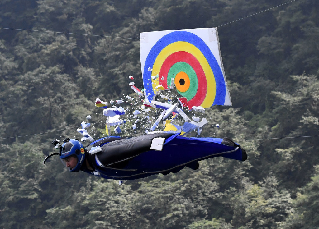 2019年9月4日,湖南省張家界天門山國家森林公園,參加翼裝飛行世錦賽的選手在進行“人箭”精準穿靶試飛訓練。(圖源:東方IC)
