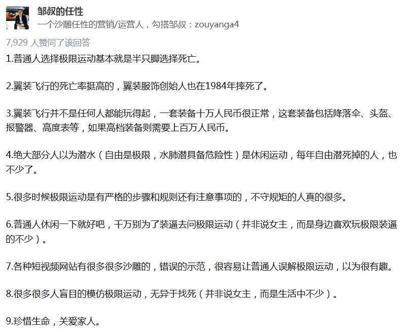 對此,網友@鄒叔的任性 也表達了自己的看法,他寫道“普通人選擇極限運動基本就是半隻腳選擇死亡。”