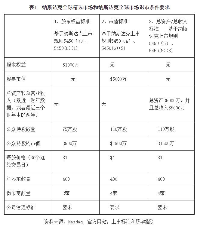 在納斯達克全球精選市場和納斯達克全球市場的已上市企業,如要繼續掛牌,必須達到下列(表1)三組條件中的至少一組,否則,該企業將被退市。